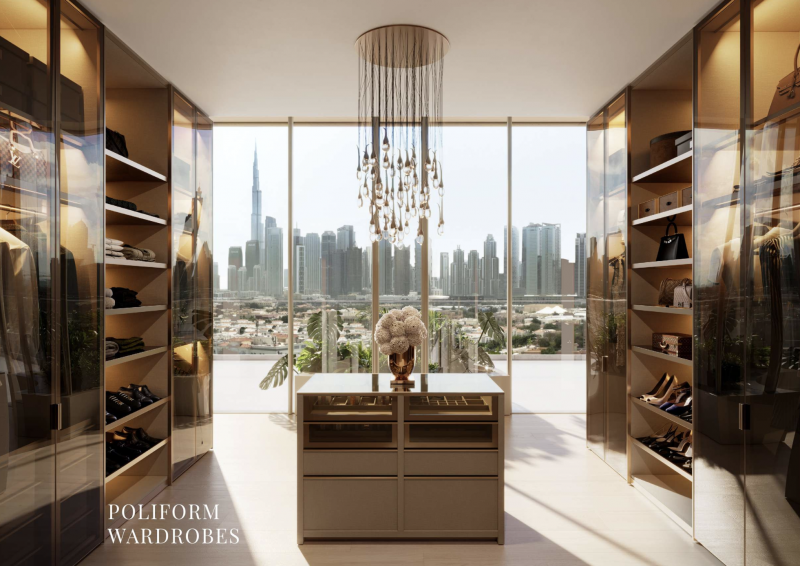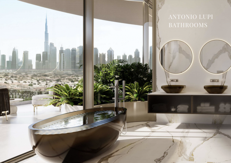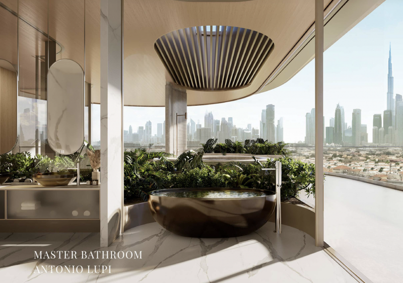 Die Fassaden wurden so gestaltet, dass sie das Licht einfangen und 180-Grad-Ausblicke schaffen – auf den Burj Khalifa, die glitzernde Downtown Skyline, den Dubai Water Canal und die umliegenden Grünflächen. Innen erwarten die Bewohner doppelte Raumhöhen, elegante Kurven, Poliform-Küchen mit Gaggenau-Geräten und eine Materialwelt, die Luxus auf leise und zeitlose Weise ausdrückt.