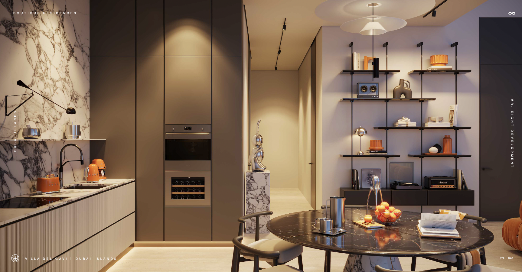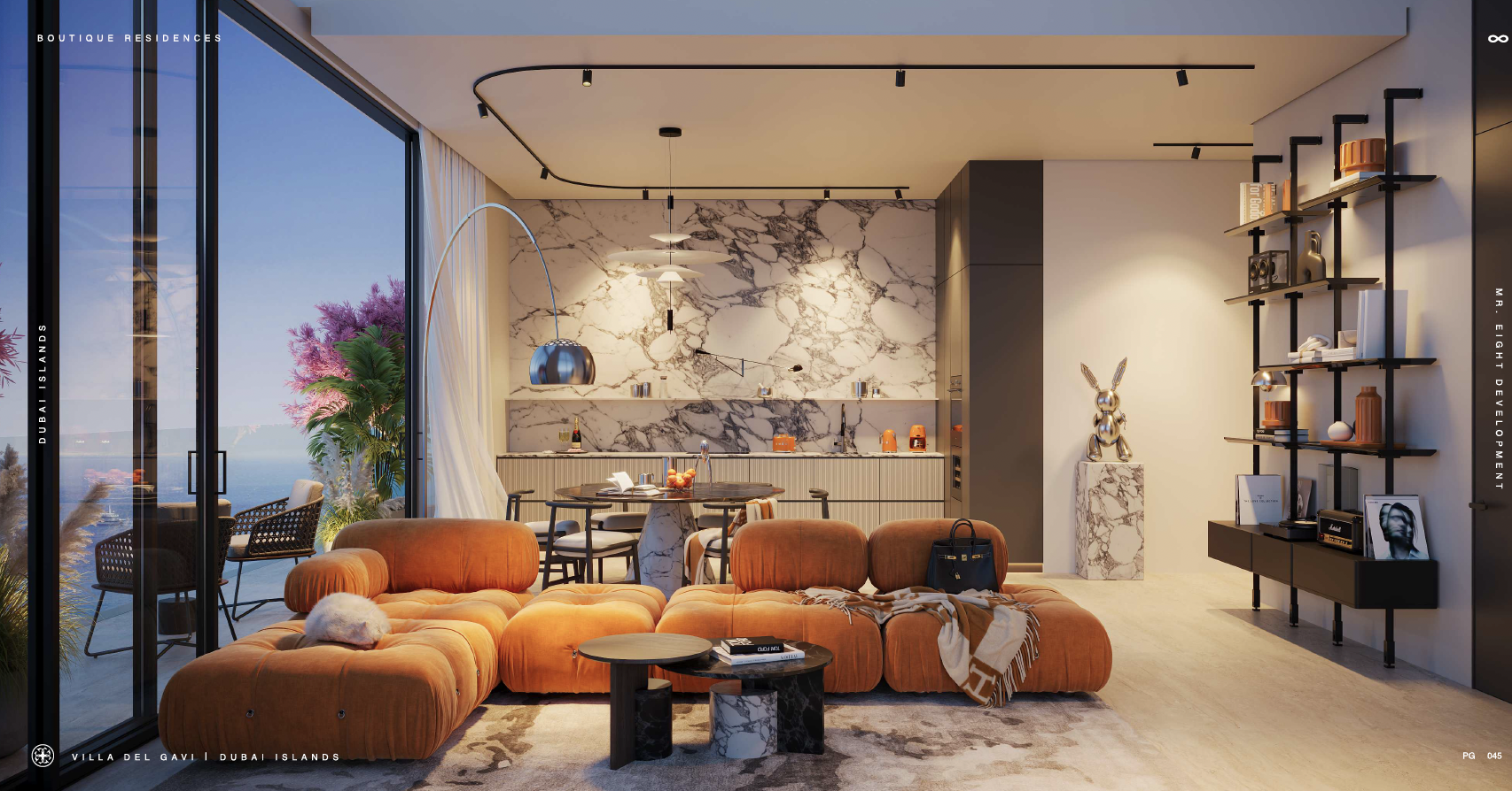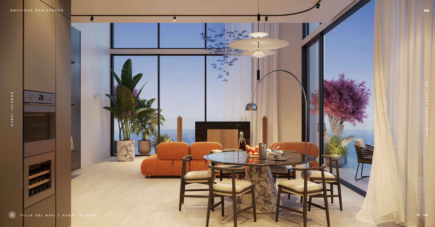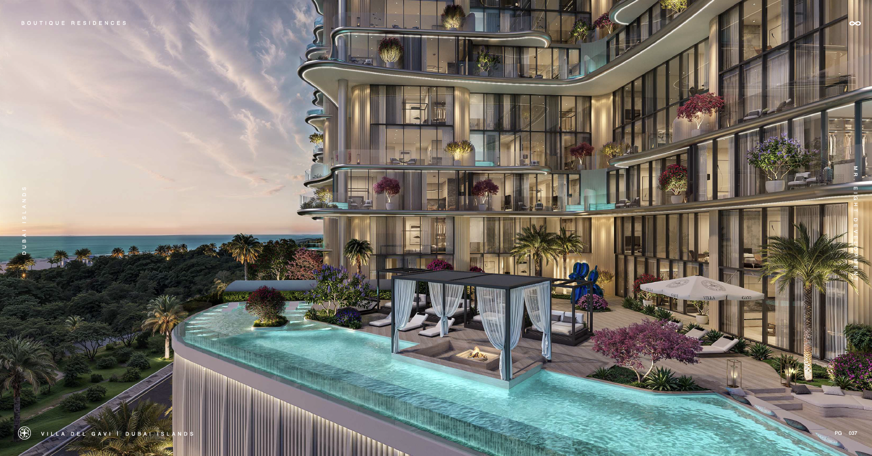 Villa del GAVI präsentiert sich als Inbegriff luxuriösen Wohnens – hoch über der Küste von Dubai Islands, mit freiem Blick auf das Arabische Meer und die Skyline von Dubai. Dieses Boutique-Residences-Projekt umfasst nur 87 großzügige Apartments mit zwei bis vier Schlafzimmern, bewusst ohne Einzimmer-Wohnungen geplant, um Raum und Lebensqualität zu maximieren. Die Architektur und Innenräume vereinen natürliche Materialien wie italienischen Travertin und Calacatta-Viola-Marmor mit Designerstücken von Tom Dixon, Fabel Casa Küchen und hochwertigen SMEG-Geräten. Jeder Wohnraum ist ein Statement für Stil, Raumgefühl und anspruchsvolle Ästhetik.