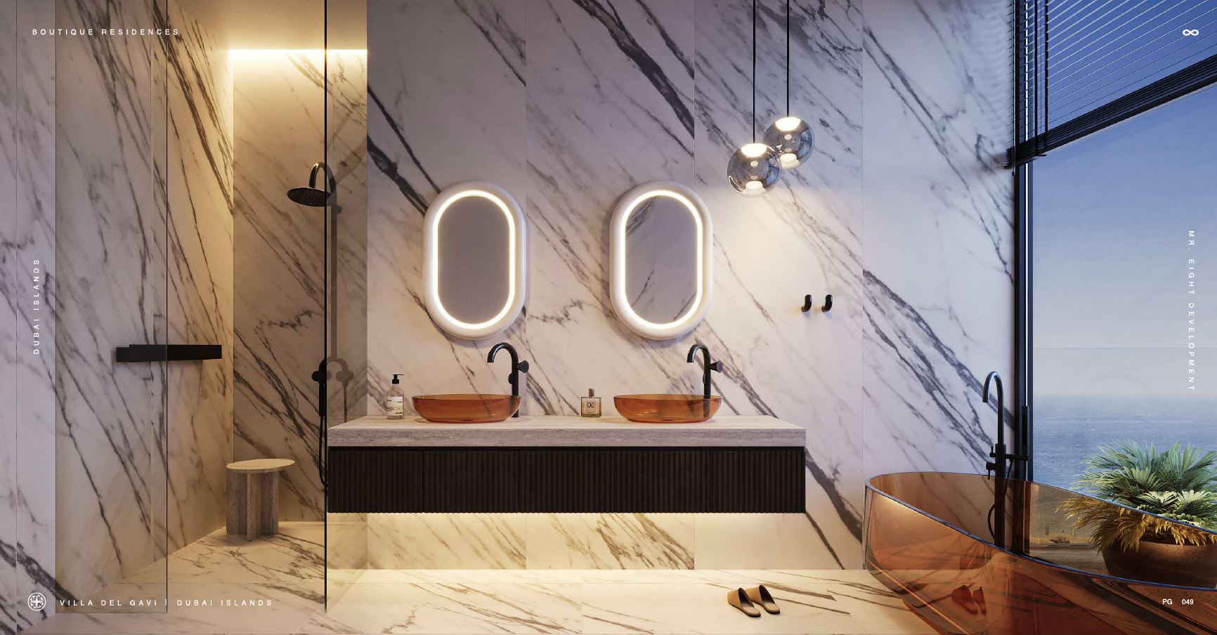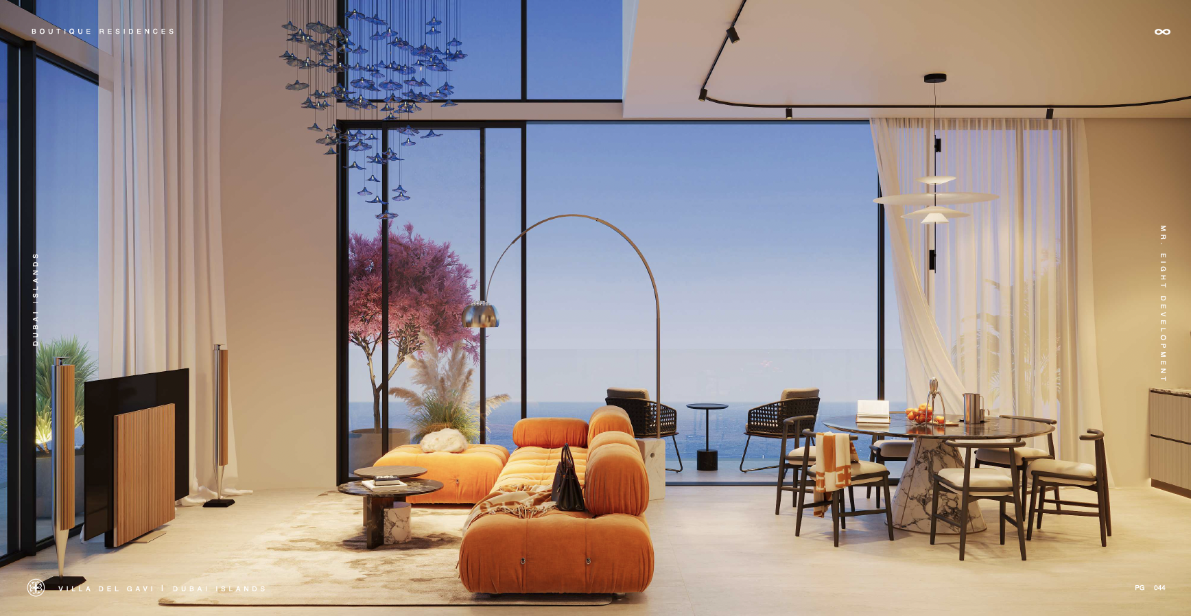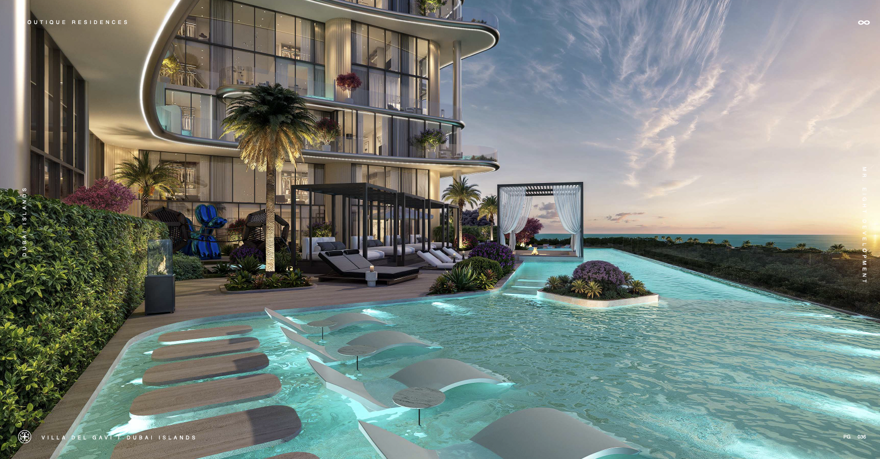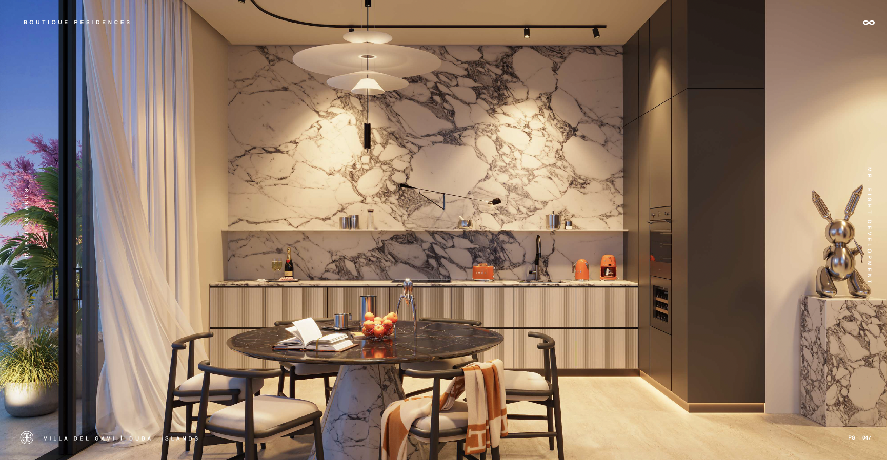 Villa del GAVI präsentiert sich als Inbegriff luxuriösen Wohnens – hoch über der Küste von Dubai Islands, mit freiem Blick auf das Arabische Meer und die Skyline von Dubai. Dieses Boutique-Residences-Projekt umfasst nur 87 großzügige Apartments mit zwei bis vier Schlafzimmern, bewusst ohne Einzimmer-Wohnungen geplant, um Raum und Lebensqualität zu maximieren. Die Architektur und Innenräume vereinen natürliche Materialien wie italienischen Travertin und Calacatta-Viola-Marmor mit Designerstücken von Tom Dixon, Fabel Casa Küchen und hochwertigen SMEG-Geräten. Jeder Wohnraum ist ein Statement für Stil, Raumgefühl und anspruchsvolle Ästhetik.